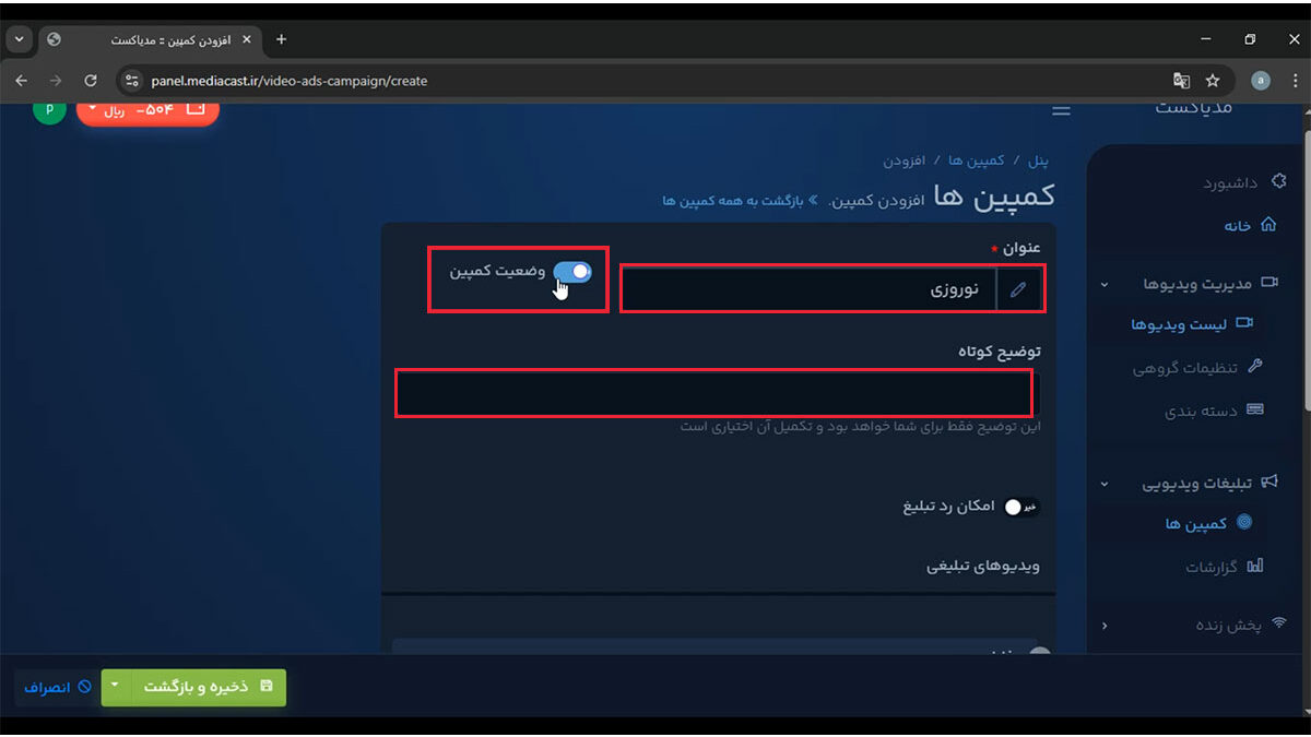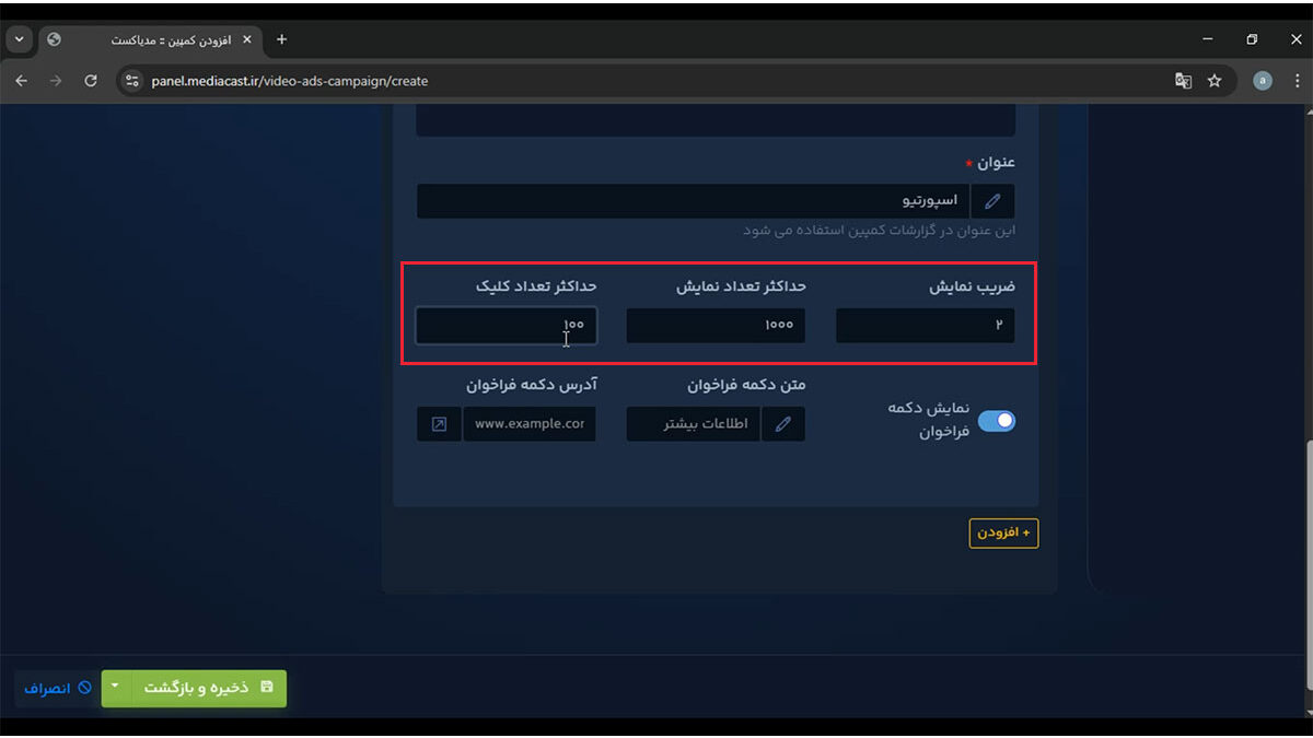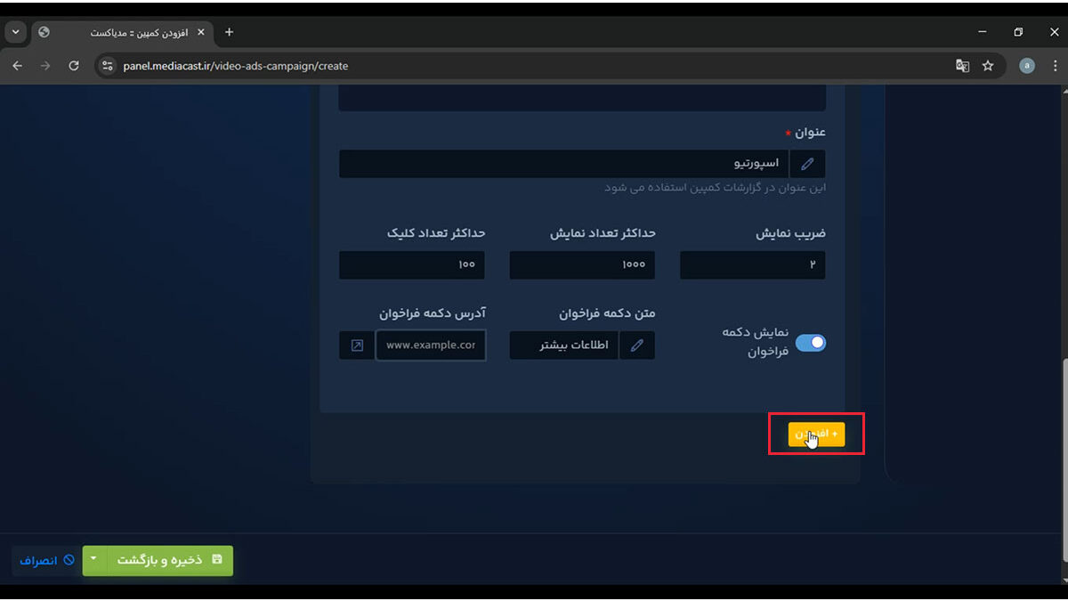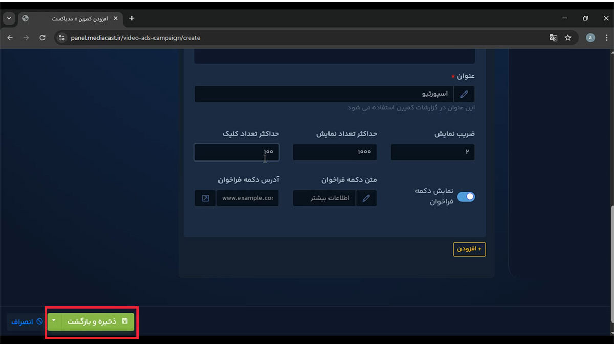 پس از انجام تمام تنظیمات، روی دکمه ذخیره و بازگشت کلیک کنید تا کمپین شما با موفقیت ثبت شود.