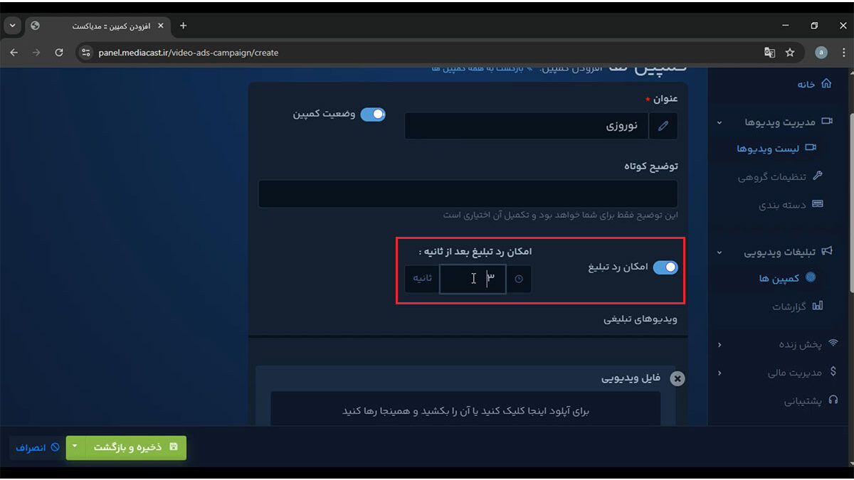 اگر میخواهید کاربران بتوانند تبلیغ را رد کنند، گزینه امکان رد تبلیغ را فعال کنید و زمان مجاز (مثلاً ۳ ثانیه) را تعیین نمایید.