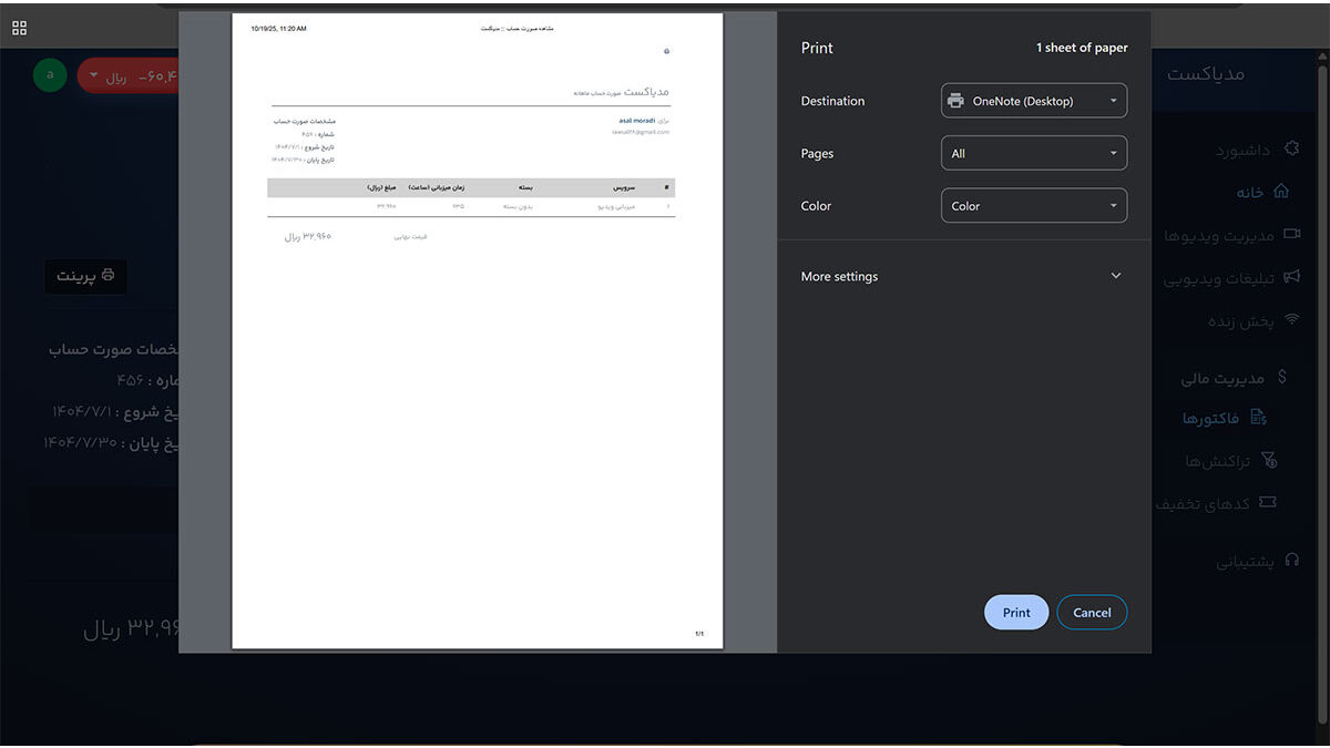 - برای حسابداری دقیقتر، میتوانید از گزینهی پرینت یا ذخیره PDF فاکتورها برای آرشیو استفاده کنید.