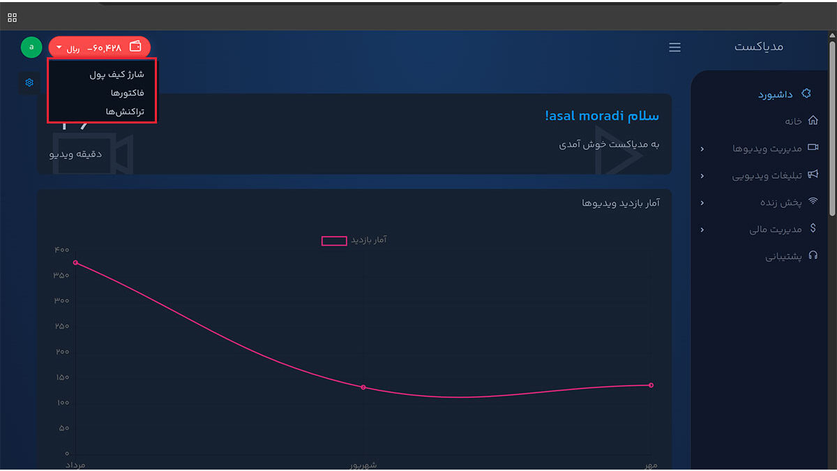 در هر صفحه از مدیاکست که باشید، کافیست روی آیکون کیف پول در بالای صفحه کلیک کنید و گزینهی «فاکتورها» را انتخاب نمایید.